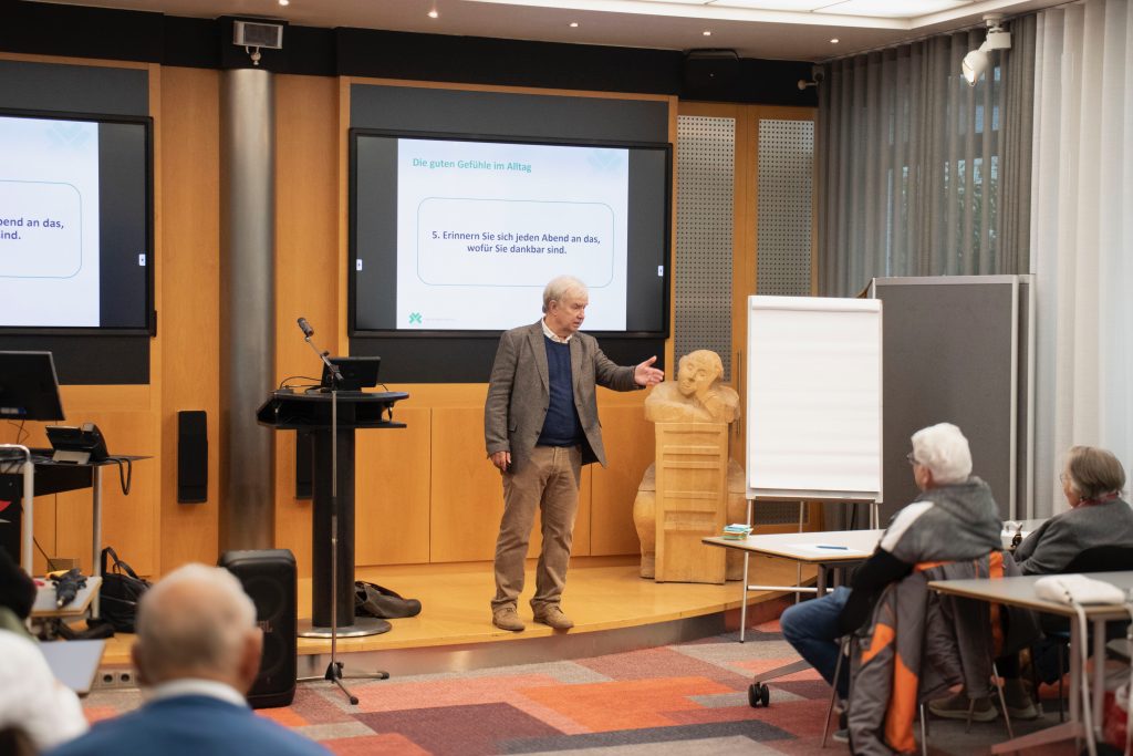 In seinem Vortrag erklärte Schubert: Glück ist nichts Einheitliches – es muss individuell erlebt und gestaltet werden. Glück beginnt im Kopf, ist kein Zufallsprodukt und kann aktiv beeinflusst werden – gerade und auch im Alter.